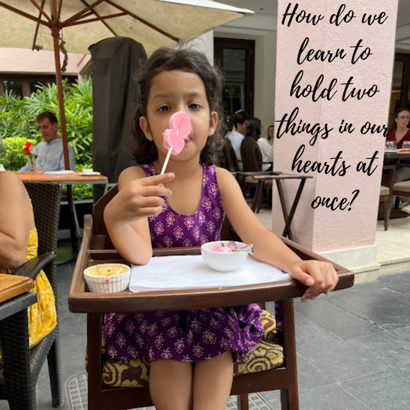 My mother bought a box of blueberries this afternoon and divided it up into bowls for each of us. My five-year-old daughter loved them and, as soon as her grandparents noticed, both added their share to her bowl. My husband and I, wandering in other parts of the house, finished our own bowls. As my daughter’s blueberries were almost over she asked, “Amma, do you have some more?” And as my mother explained that there were no more, I wished that I hadn’t eaten mine as yet. My daughter went back to what she was doing, continuing to savour her last blueberry one little lick at a time. “Look, Mama, how I’m saving it…”, she said a couple of times. And then, for just a moment, she stepped away from the table to look at something else. My husband, from whom she obviously inherits her special fondness for blueberries, was walking past distractedly and in a split second he popped that precious half blueberry into his mouth. As soon as he saw my face fall, he knew what had happened. As our daughter turned around, he broke the news to her, “Darling, I’m so sorry… I accidentally ate your blueberry…” Even as her little face crumpled, she said, “It’s okay, Daddy…” I scooped her up into my arms, knowing she needed to cry, but her father wanted to give her a hug too. She obliged, holding onto him tightly, as her eyes filled with tears that began to tumble down her cheeks making splotches on his t-shirt. “It’s okay, Daddy,” she repeated softly. And just like that our tiny person was able to hold two things in her heart at once. She was mourning the loss of her last blueberry and yet being kind to her apologetic father. I suppose this is the beginning of growing up…
