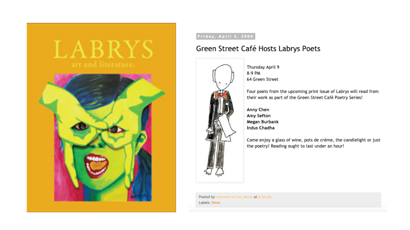 “Summer Postcards” appeared in the Spring 2009 issue of Labrys: Art & Literature and was read as part of the Green Street Café Poetry Series on April 9, 2009.